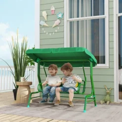 Qaba Kids Patio Swing, 2-Seater Outdoor Porch Swing Bench With Adjustable Canopy, Safety Belt For Patio, Garden, Poolside, Balcony